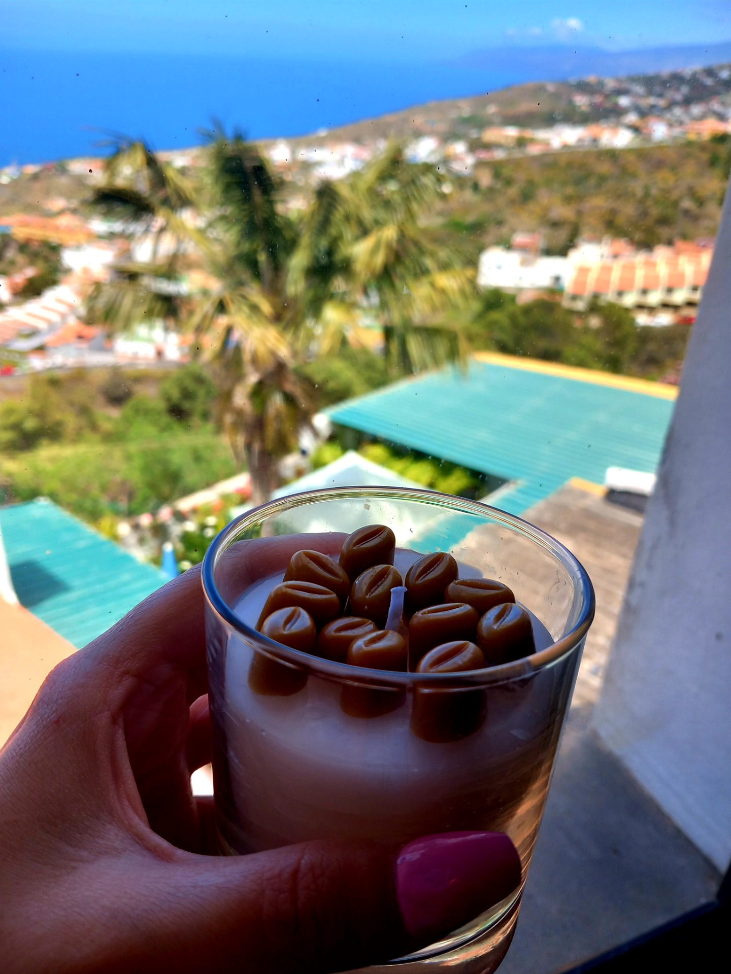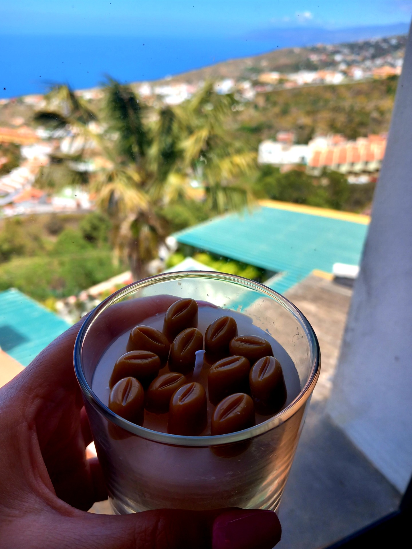 Vela con granitos de café. Aroma a café o cualquier aroma disponible.